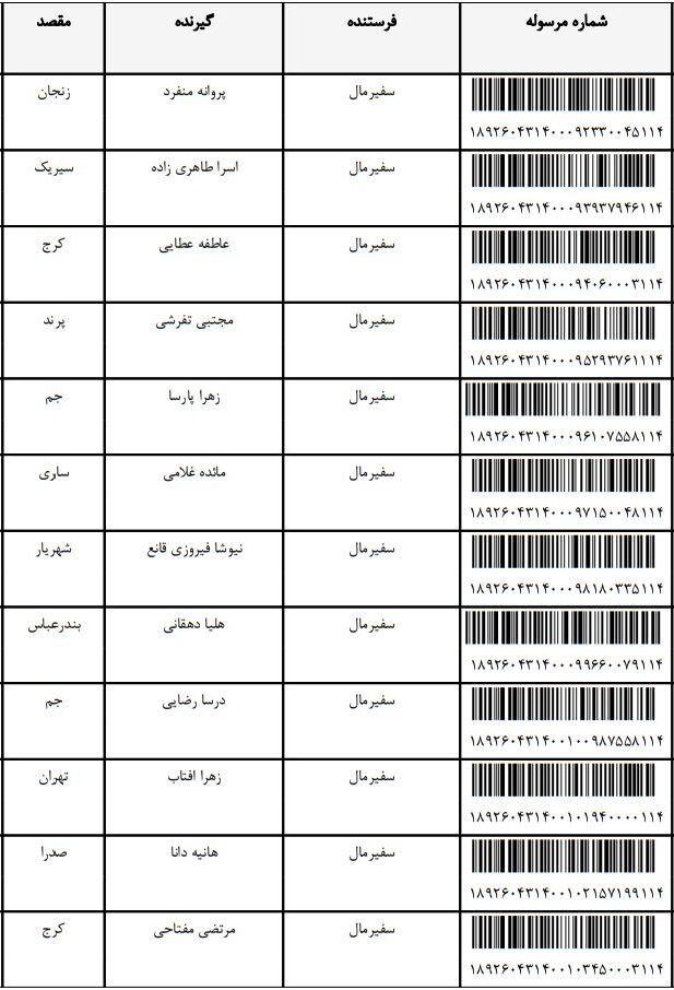پیگیری مرسوله بسته پستی جهت پیگیری وضعیت سفارش خود، مراحل زیر را انجام دهید.کلیک روی دکمه "دریافت فایل کد رهگیری پستی + تاریخ"جستجوی نام خود در فایلکلیک روی عبارت رهگیری مرسوله فایل کد رهگیری پستی 10 دی الی 13 دیفایل کد رهگیری پستی 14 دیفایل کد رهگیری پستی 15 الی 16 دیفایل کد رهگیری پستی 17 دی الی 6 بهمنفایل کد رهگیری پستی 7 بهمن