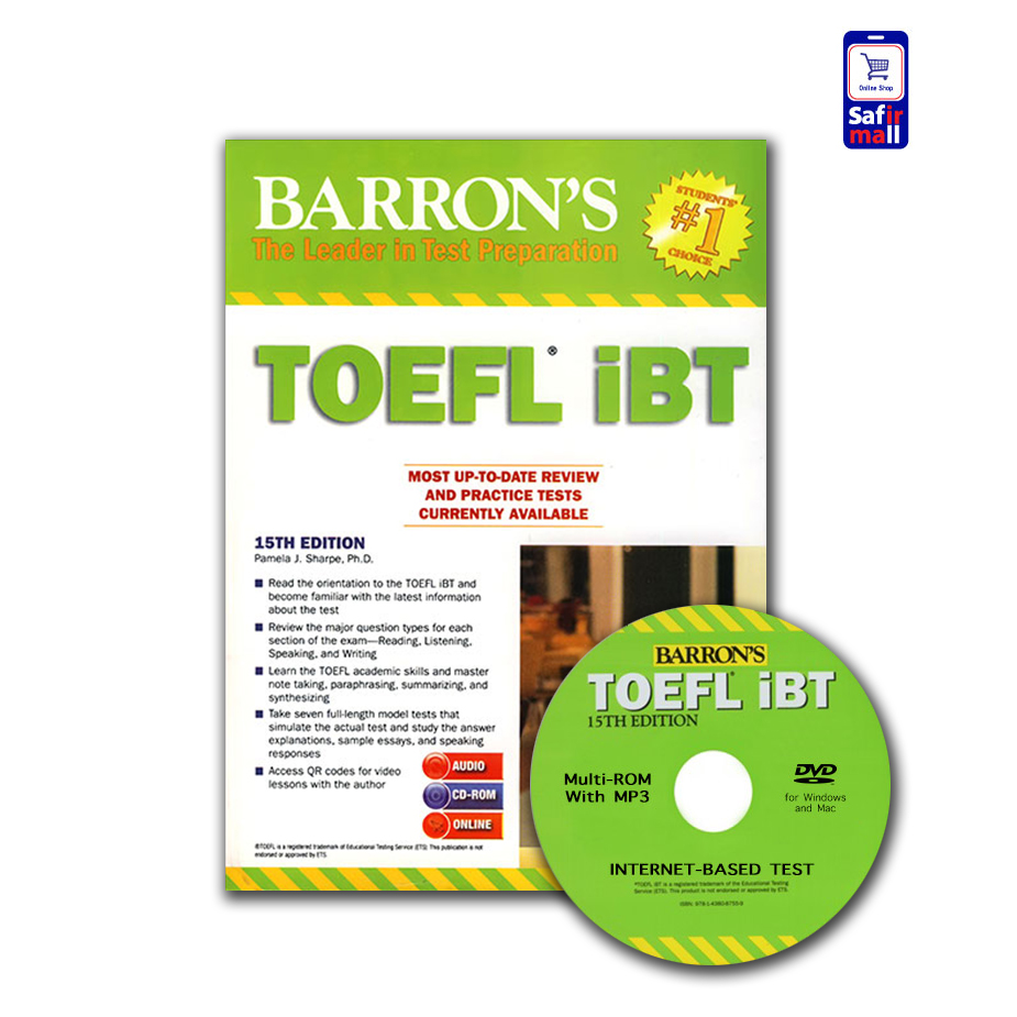 در این کتاب شما با کلیات آزمون تافل آشنا خواهید شد و هشت نمونه کامل آزمون همراه با پاسخ های تشریحی، نمونه سوالات Writing، و نکاتی خاص و یژه در مورد مهارتهای مورد نیاز مانند یادداشت برداری، خلاصه کردن، ترکیب کردن و مروری بر مهارتهای چهارگانه آزمون را فرا خواهید گرفت.DVD آموزشی همراه کتاب Barron’s TOEFL iBT 15th edition شامل راهنماهای صوتی برای تمامی تمرینهای بخش های Writing، Speaking و Listening است که به ویژه در بخش Listening داوطلب را با مکالمه و لهجههای انگلیسی بیشتر آشنا میکند.